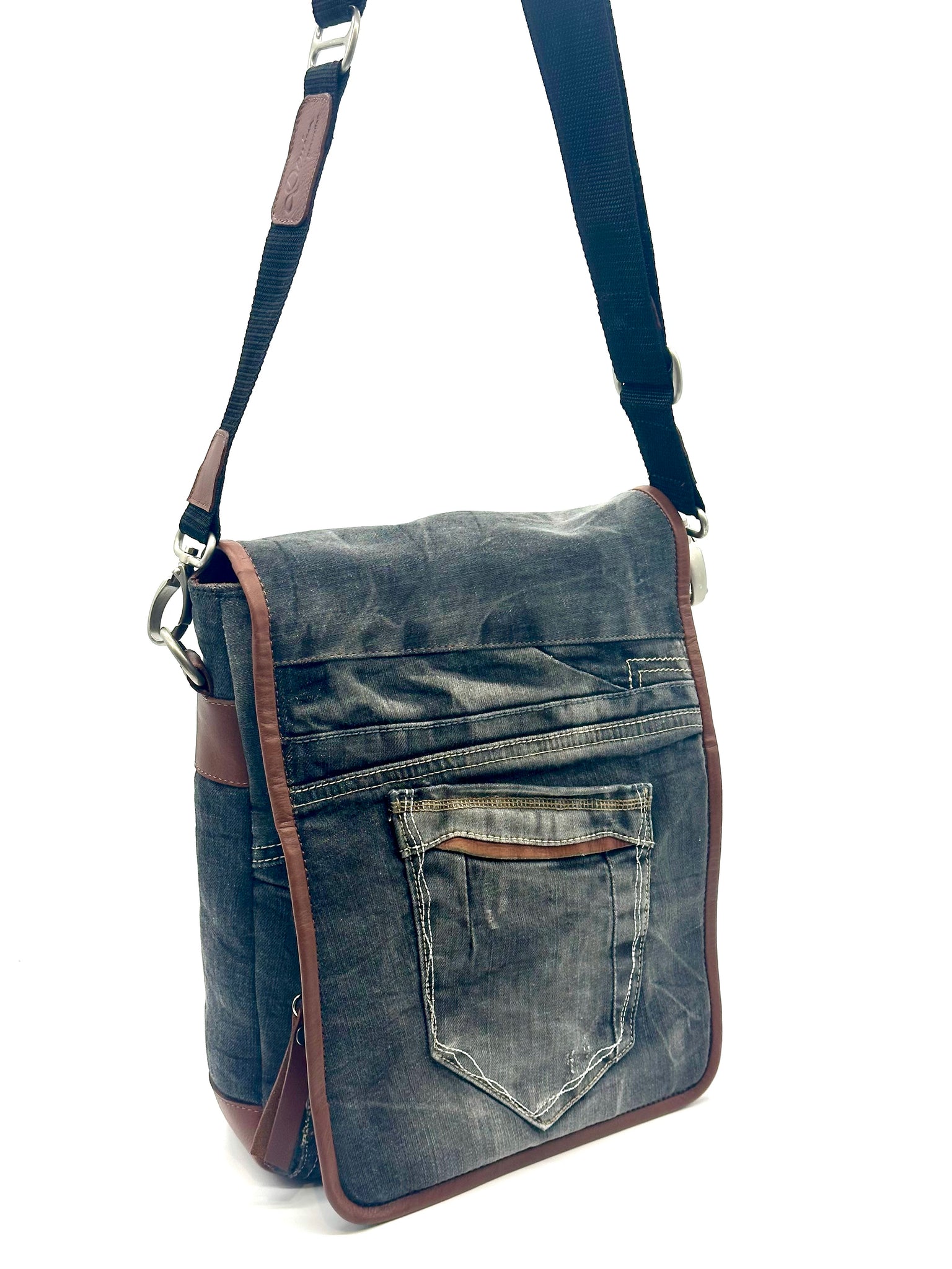 A diverse satchel for work or everyday. Fits a small laptop or iPad. Made from repurposed jeans and utilises original pockets.