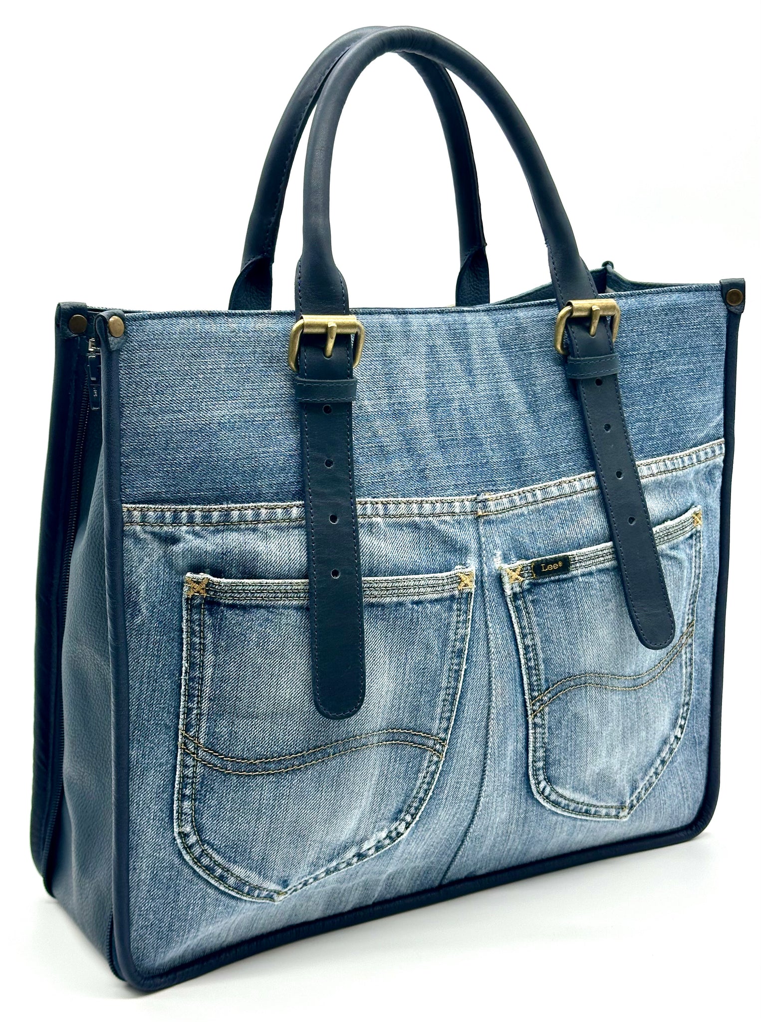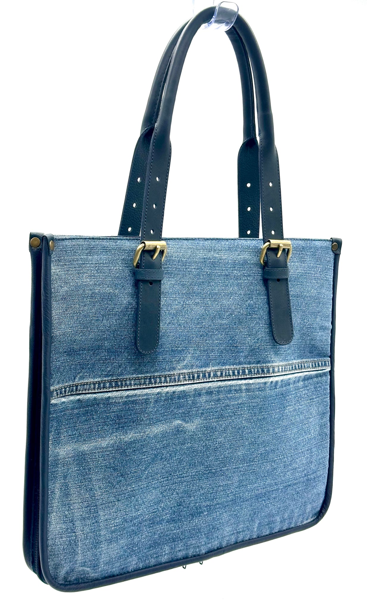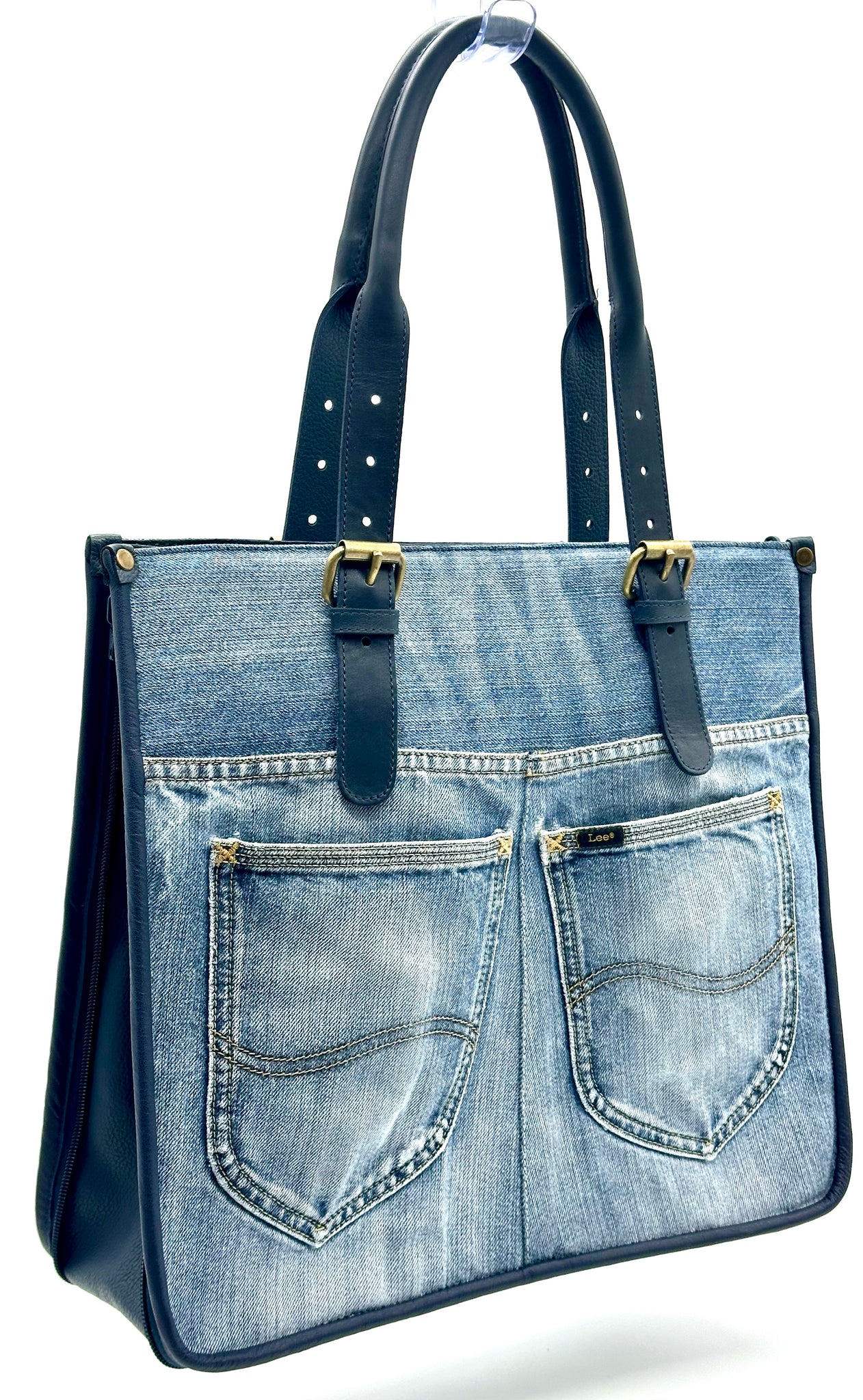 This large denim tote is a great laptop or work bag. With a zip gusset you can carry Hope completely flat or expand out to fit even more of your daily essentials. Like all the styles in our Denim Generation range, Hope is made from pre-loved designer jeans and finished with quality navy leather trims.