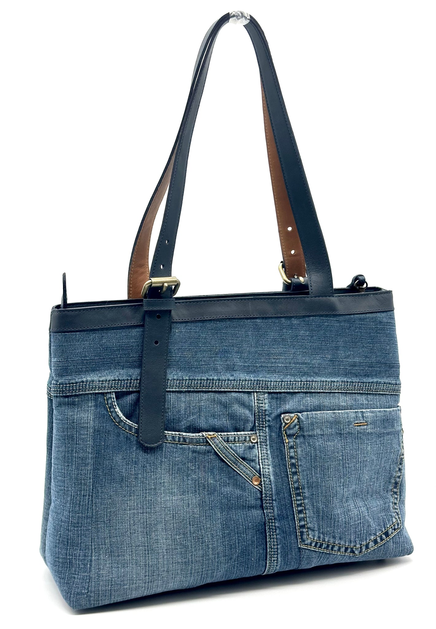 A unique twist on the classic tote bag. Like all bags in our Denim Generation range, Nadia is made from pre loved designer jeans in a classic blue denim and finished with quality navy leather trims